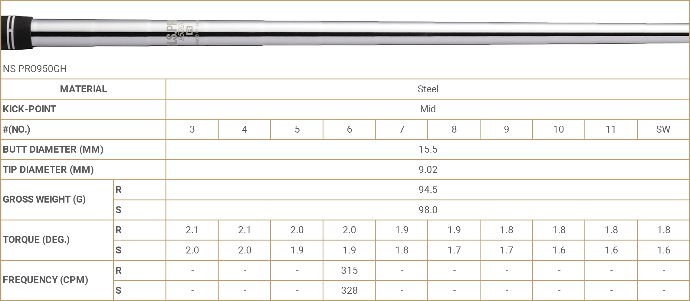 | LENGTH (INCH) | NS PRO950GH | 39.0 | 38.5 | 38.0 | 37.5 | 37.0 | 36.5 | 36.0 | 35.5 | 35.0 | 35.0 | |
