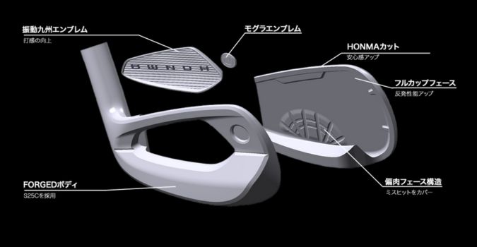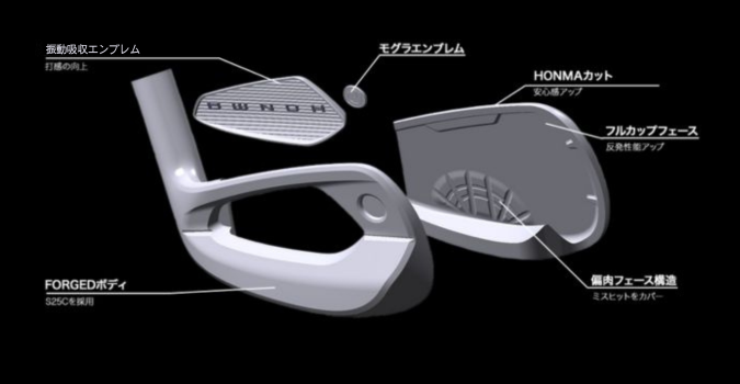 軟鉄鍛造ボディに振動吸収エンブレムを組み合わせて、心地よい打感を実現。フェース上部を斜面研磨するHONMAカットで、見た目のやさしさを演出。