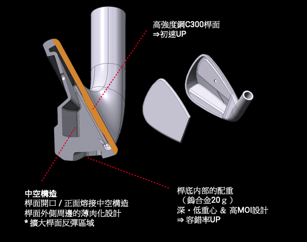 寬闊的桿緣底部、 透過專用桿面角度設定 達到深・低重心,是一款重視 精準擊球與高彈道的易打球桿。